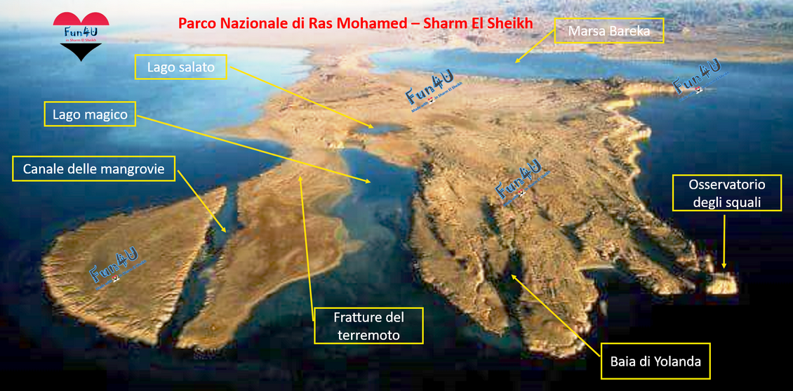 La zona di Ras Mohamed è diventata Parco Nazionale Marino nel 1983, è una riserva naturale di mare e di terra che si estende su un’area circa 480 km. L'arido terreno desertico è caratterizzato da dune di sabbia, laghi di mangrovie, pianure di ghiaia, baie desertiche, coralli fossili e montagne di granito. Accoglie numerose specie animali e volatili: gazzelle Dorcas, stambecchi della Nubia e volpi rosse, nonchè, sterne, aironi, gabbiani e falchi pescatori. L'ecosistema sottomarino è una meravigliosa esplosione di vita: circa duecento specie di coralli, mille specie di pesci, quarantacinque specie di stelle di mare, venti di ricci, circa cento di molluschi, duecento di crostacei e solo due specie di tartarughe, la tartaruga verde e la tartaruga a becco di falco. Il Parco Nazionale di Ras Mohamed è noto in tutto il mondo per la straordinaria bellezza della sua barrriera corallina considerata una delle più spettacolari del mondo. All' interno del Parco marino si trovano tanti siti che offrono immersioni spettacolari come Shark, Ras Ghazolani, Jack fish Alley, Za'ater e Yolanda.