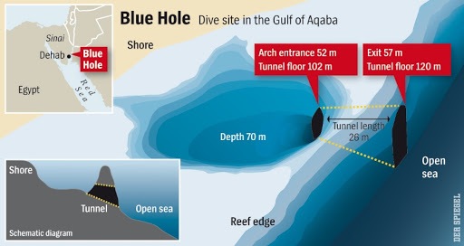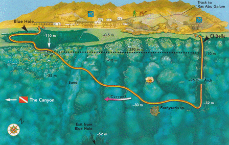 Il Blue Hole è una dolina marina, a circa 6 metri di profondità si staglia un bacino circolare ampio circa 50-80 metri, noto come "la Sella", che perfora il fondale della barriera corallina fino a una profondità apparente di circa 70 metri. Immergendosi in esso, si rende visibile sul lato est (la costa rimane sul lato nord-ovest), l'imboccatura di un ampio tunnel detto "l'Arco", la cui volta inizia a 52 metri di profondità e il fondale raggiunge quello della "Sella". L'altra estremità del tunnel, lungo 26 metri, termina in mare aperto al di là della piattaforma carbonatica costiera. Mentre la volta dell'estremità est del tunnel è nel frattempo scesa a 56 metri, il fondale si porta a 120 metri, affacciandosi sul mare aperto ad inizialmente a 130 metri di profondità
